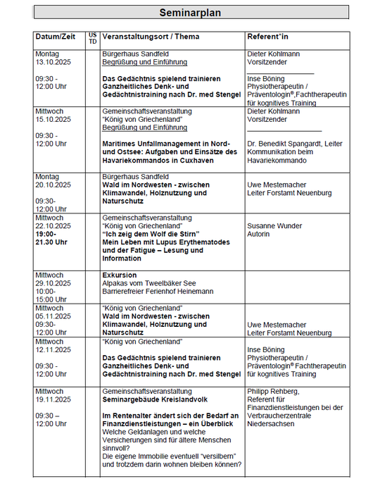 Geplant sind wieder zwei Gruppen, im "König von Griechenland", Breite Str.20, 26939 Ovelgönne und im Bürgerhaus in Sandfeld, Sandfeld 21, 36931 Elsfleth, einmal im Seminargebäude des Kreislandvolks, Albrecht-Thaer-Str. 2, Ovelgönne.